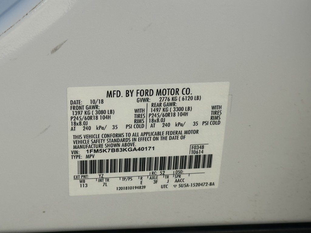 | VIN #: | 1FM5K7B83KGA40171 |
