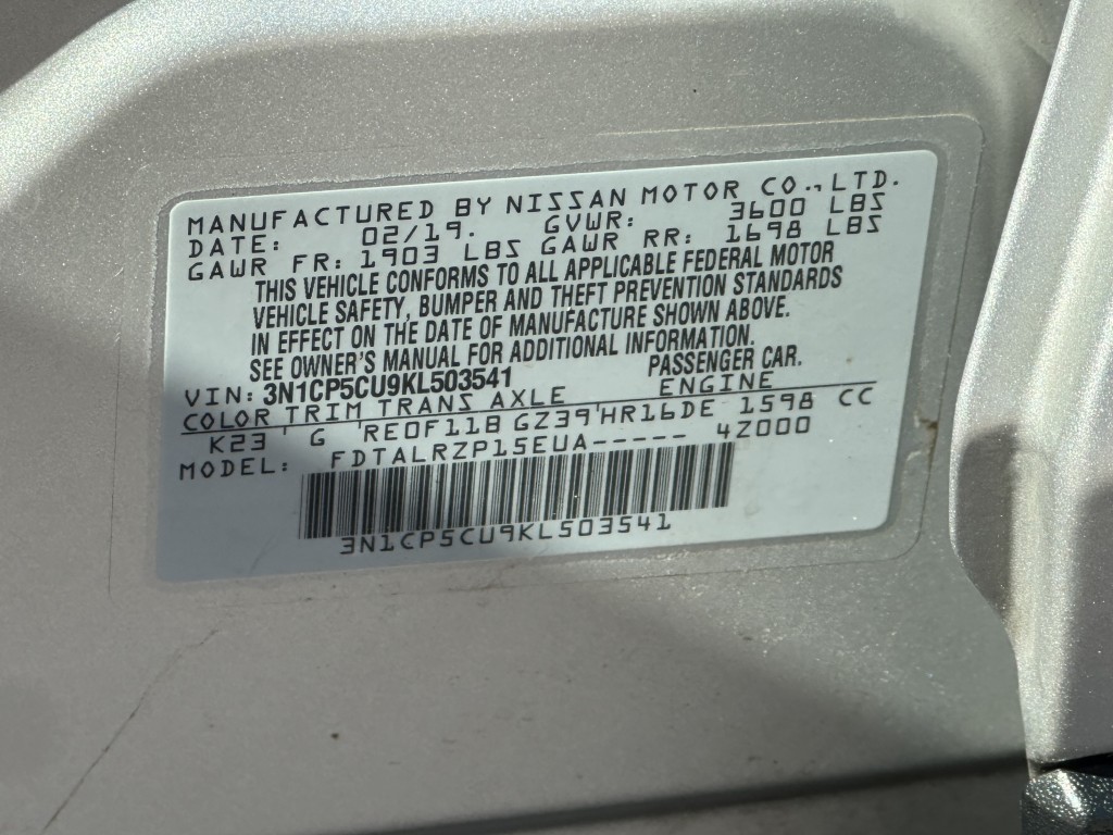 | VIN #: | 3N1CP5CU9KL503541 |