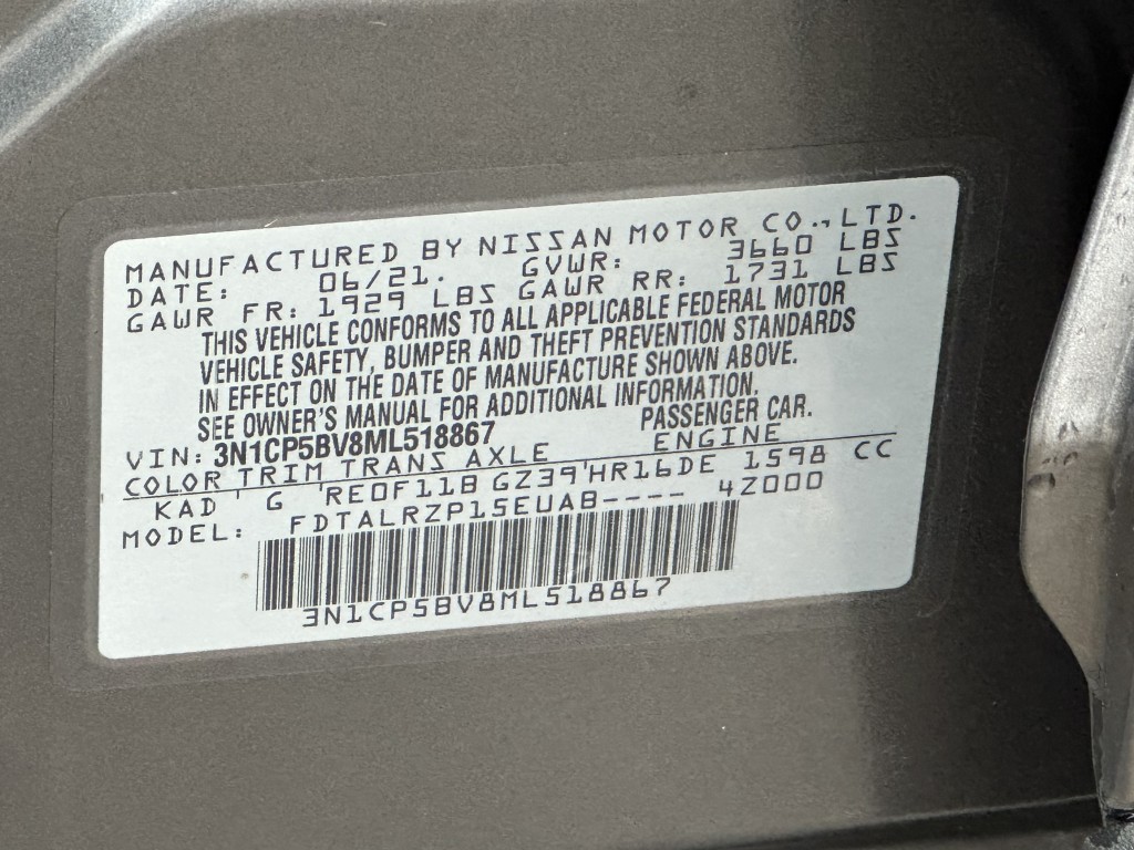 | VIN #: | 3N1CP5BV8ML518867 |
